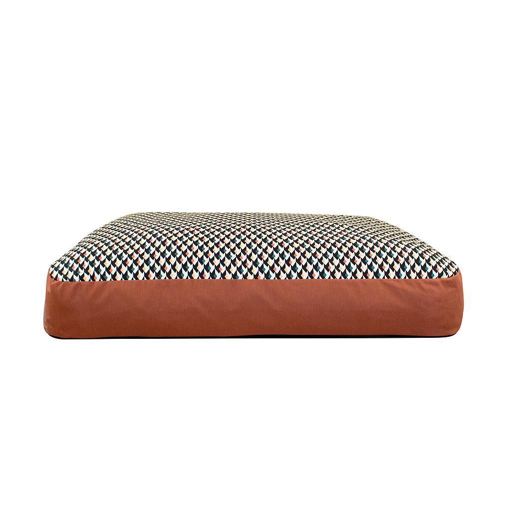 El colchón Happy Izaro Monet de Yagu, con medidas de 76  51  17 cm, está diseñado para ofrecer un descanso cómodo a perros de tamaño pequeño. Su diseño presenta un estampado geométrico inspirado en los años 70, combinado con una base lisa atemporal que aporta un contraste moderno y elegante. Fabricado con materiales de alta calidad, proporciona una superficie suave y acogedora. La base antideslizante garantiza estabilidad sobre diferentes tipos de suelo. Ligero y fácil de trasladar, es perfecto para colocar en cualquier lugar del hogar.